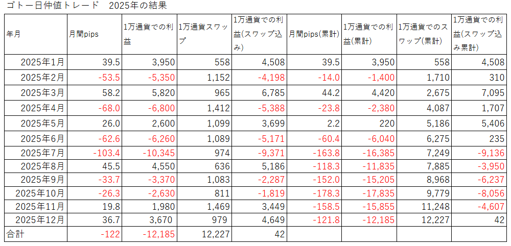 前年の2024年はスワップ抜きで130円の損失、スワップ込みで17,387円の利益でしたから2025年は悪化したと言って良いです。