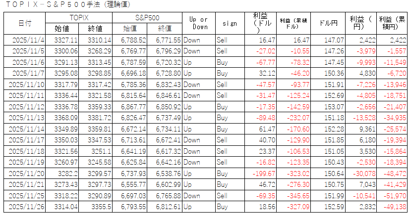 2025年11月は理論値が 日経平均ーNYダウ手法、TOPIX-S&P500手法ともにマイナス、 実取引も同様の結果となりました。