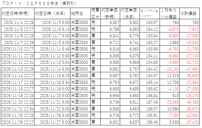 最後に、2025年11月のTOPIX-S&P500手法(実取引)の結果です。