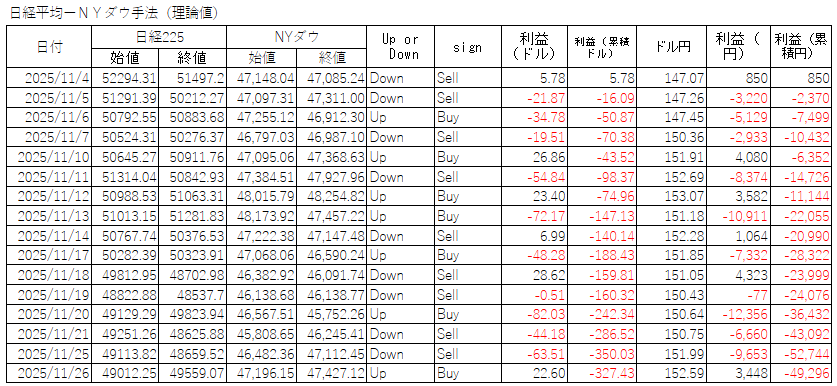 - 2025年11月の日経平均ーNYダウ手法(理論値)
