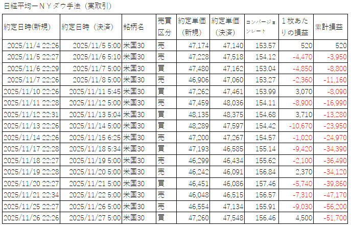 2025年11月の日経平均ーNYダウ手法(実取引)