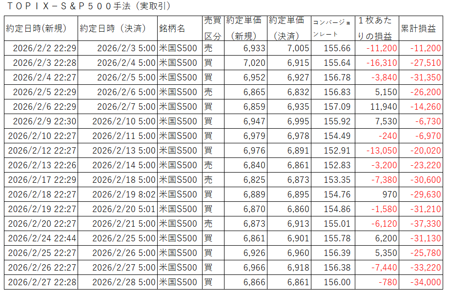 最後に、2026年2月のTOPIX-S&P500手法(実取引)の結果です。
