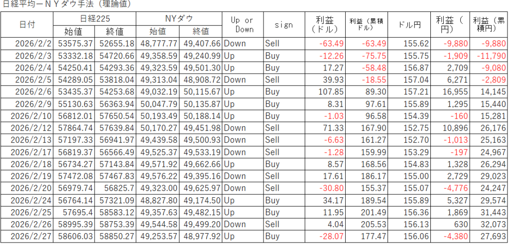 2026年2月の日経平均ーNYダウ手法(理論値)