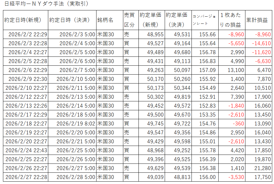 続きまして、2026年2月の日経平均ーNYダウ手法の実取引の結果です。