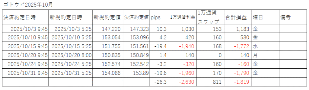 2025年10月のFXゴトー日仲値トレードは下記の日にちに実施しました。