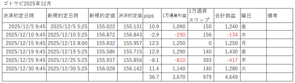 FXゴトー日仲値トレード2025年12月の結果