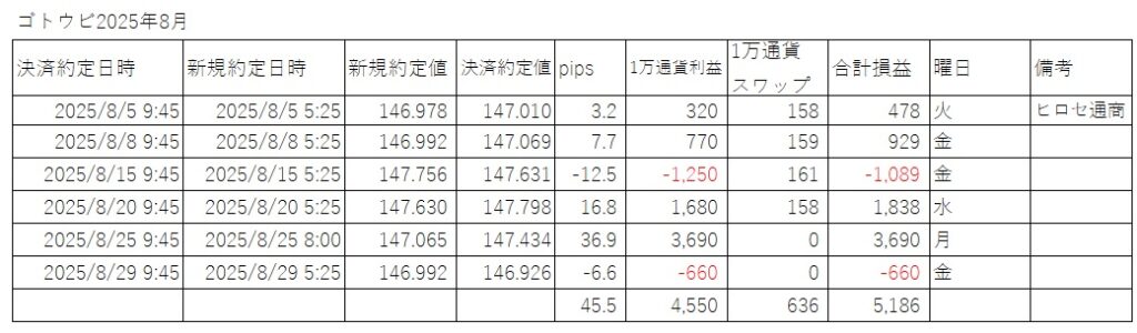 2025年8月のFXゴトー日仲値トレードは下記の日にちに実施しました。