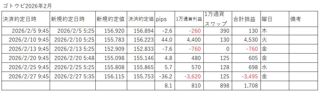 2026年2月のFXゴトー日仲値トレードは下記の日にちに実施しました。